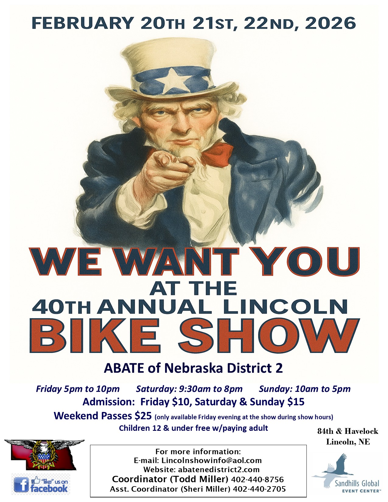 ABATE of Nebraska, Inc. is the only cohesive state organization representing YOU as a motorcycle rider. We are riders from all walks of life throughout the state and membership is open to anyone who is interested in furthering the cause of fair treatment for motorcycle riders. Whether you ride a touring bike, cruiser or sportbike; Harley, BMW or Honda; whether you choose to wear a helmet or not; man or woman; young or not so young; we ride in the same wind and must unite to protect the inherent freedom of motorcycling as well as to advocate and work to effect a safe environment on the roads.